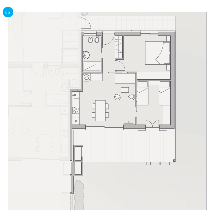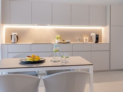 The ground-floor suites impress with bright, sun-filled interiors and a spacious private garden terrace – the perfect place to unwind and enjoy sunshine and peace. With around 70 m² of living space, they combine modern design with a Mediterranean sense of lightness: soft colors, natural materials and garden views create a relaxing atmosphere from the very first moment.