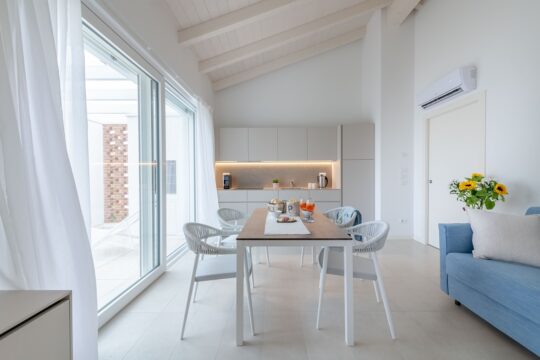 Im stilvollen Obergeschoss erwartet Sie auf rund 70 m² pure Urlaubsfreiheit – viel Raum für Erholung, Licht und Leichtigkeit. Die modern eingerichtete Suite kombiniert italienisches Design mit sanften Blau-, Grau- und Beigetönen und schafft so eine Atmosphäre zum Durchatmen und Wohlfühlen.