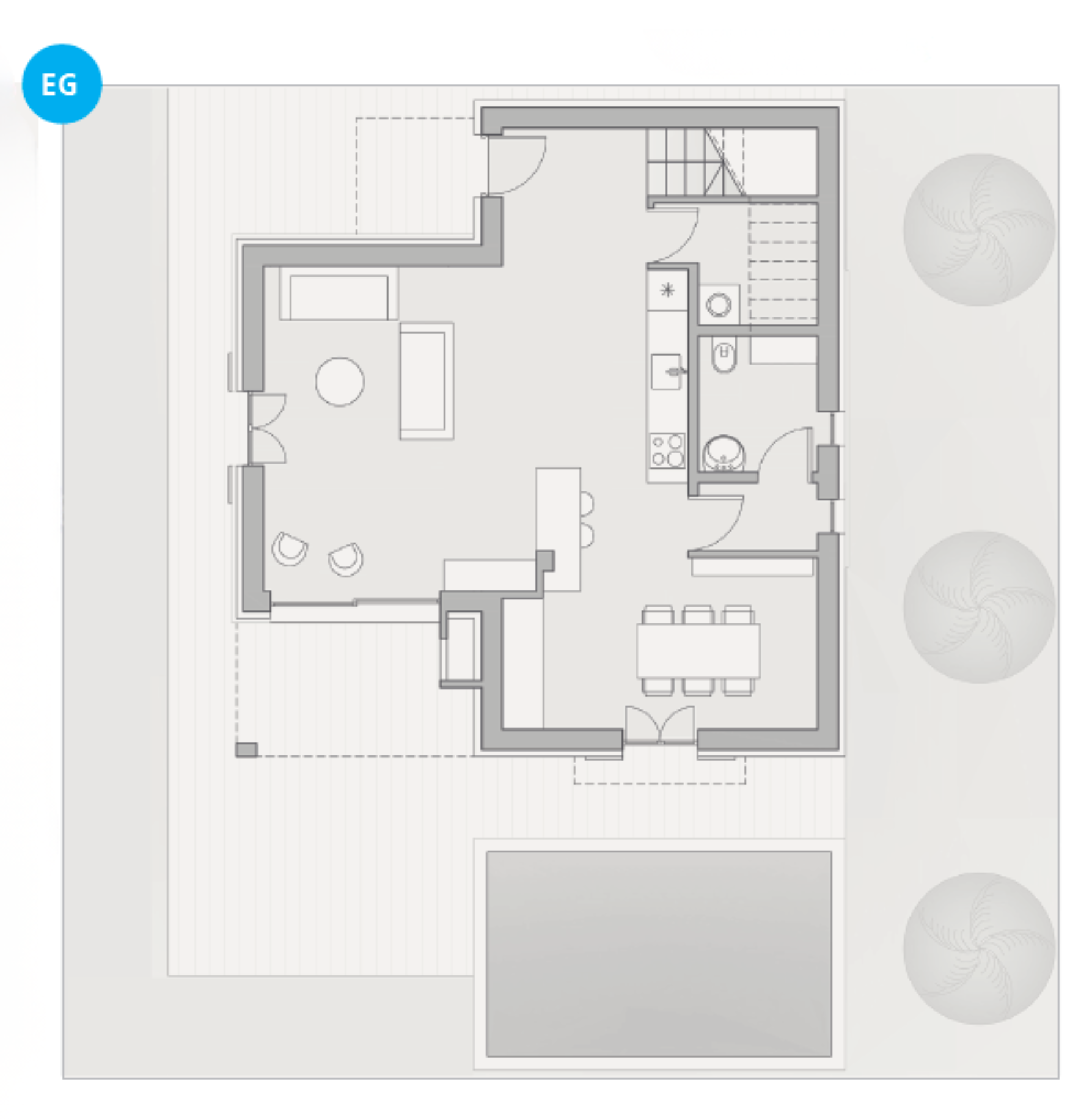 | 1 separates Gäste-WC im EG und 2 Tageslichtbäder mit Walk-in Dusche, 1 davon mit Bidet, im OG | |