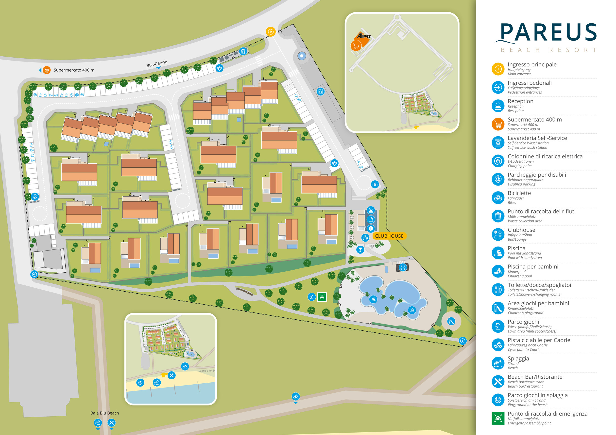 Erleben Sie das Pareus Beach Resort in Caorle aus der Vogelperspektive – zwischen goldenem Sandstrand, türkisblauem Pool und mediterranem Grün. Das Herzstück unserer Anlage: das elegante Clubhouse mit Poollandschaft, Restaurant und Beach Bar direkt am Meer.